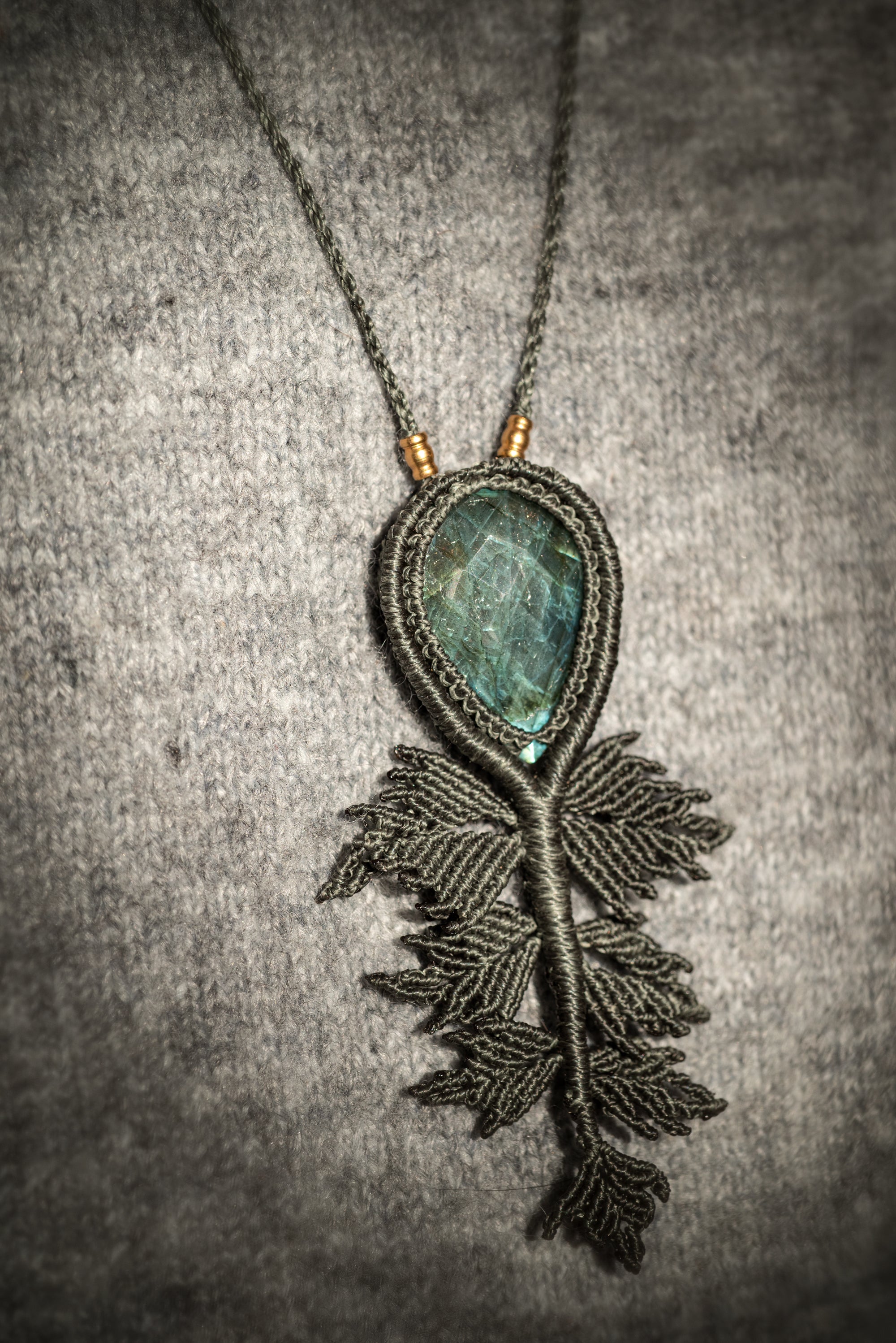 Australa unit la magie protectrice de la labradorite et la finesse des feuilles tissées en macramé.