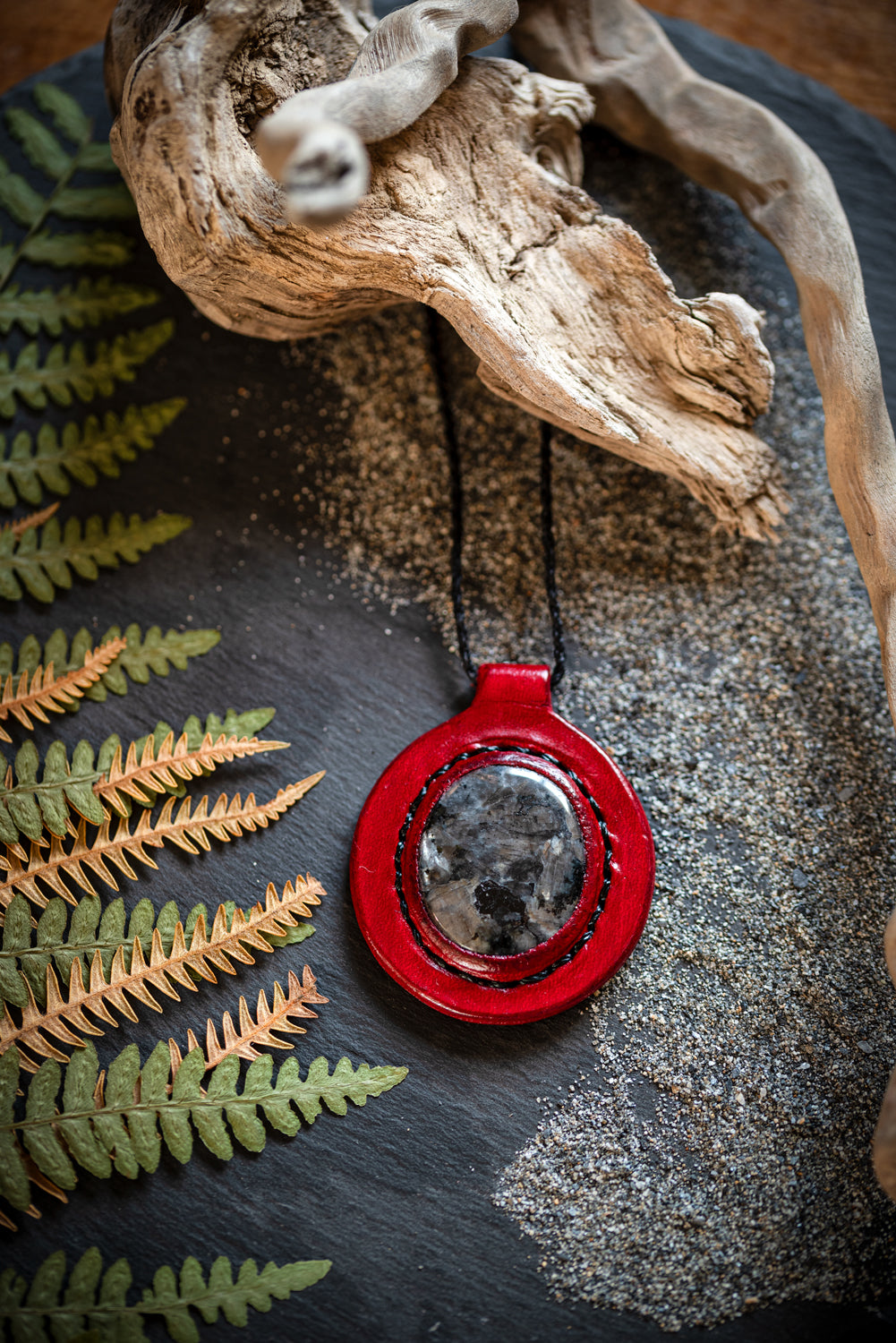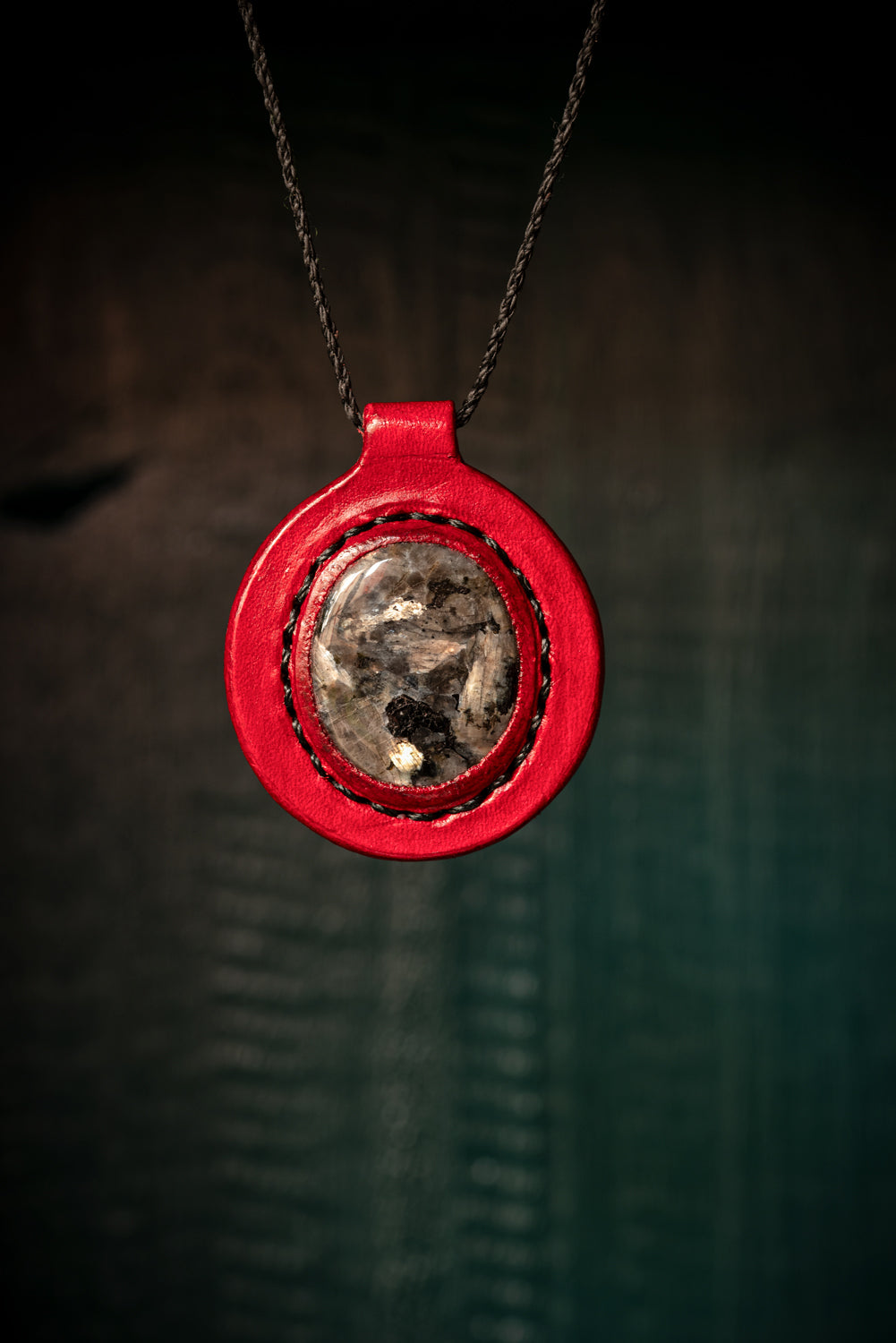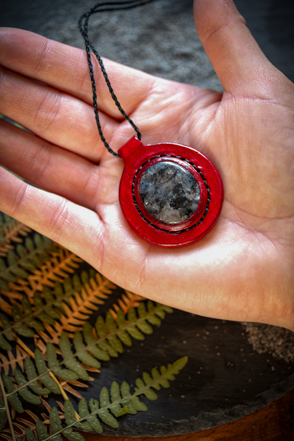 Pierre de protection psychique et de clairvoyance. Elle agit comme un bouclier énergétique, dissipe les énergies indésirables et aide à ancrer les intuitions. Le cuir rouge, Évoque le feu sacré, la force de vie, le sang des ancêtres.