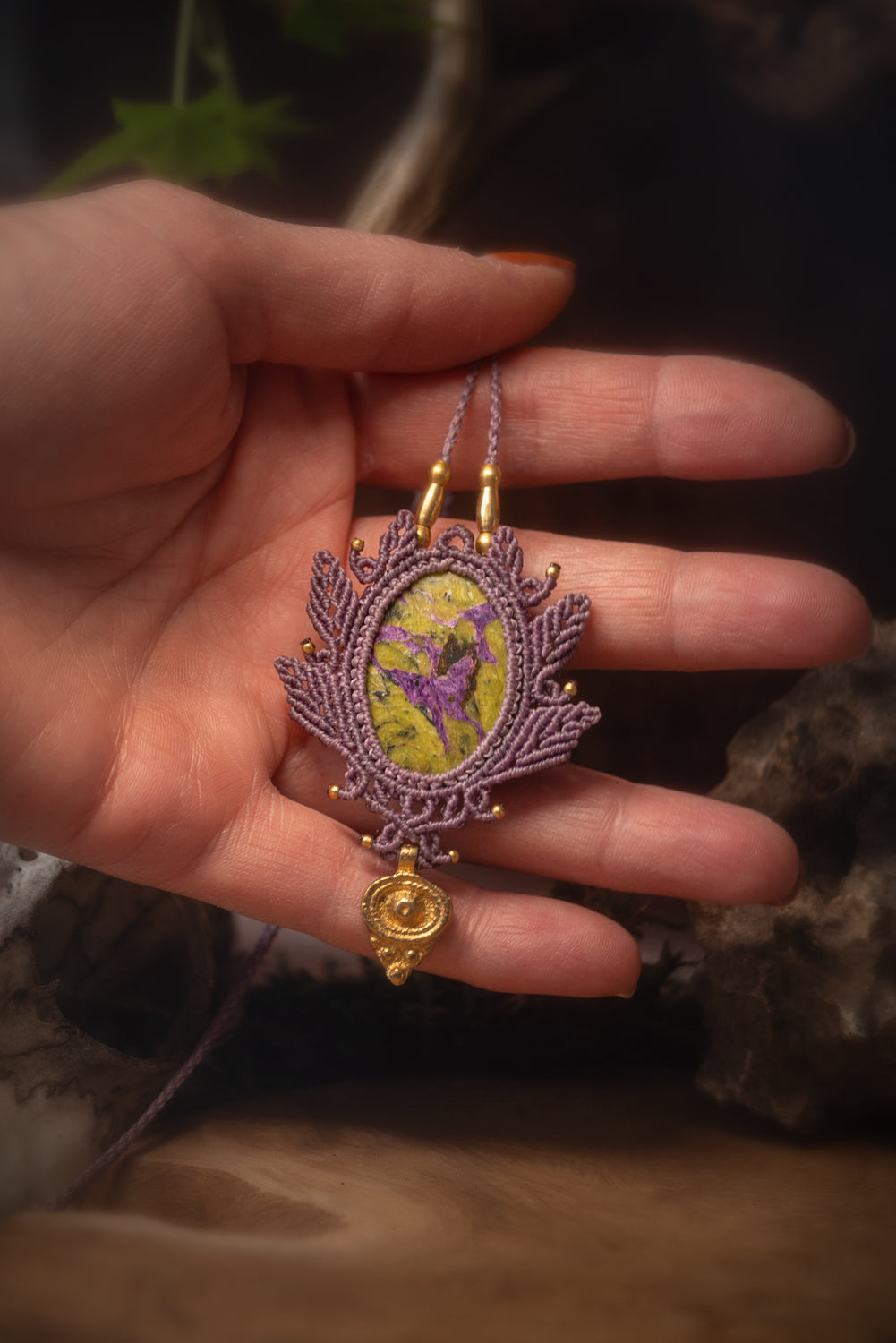 Purifiez votre collier en macramé par fumigation (sauge, Palo Santo), vibrations (bol tibétain) ou en le déposant sur une géode d’améthyste.