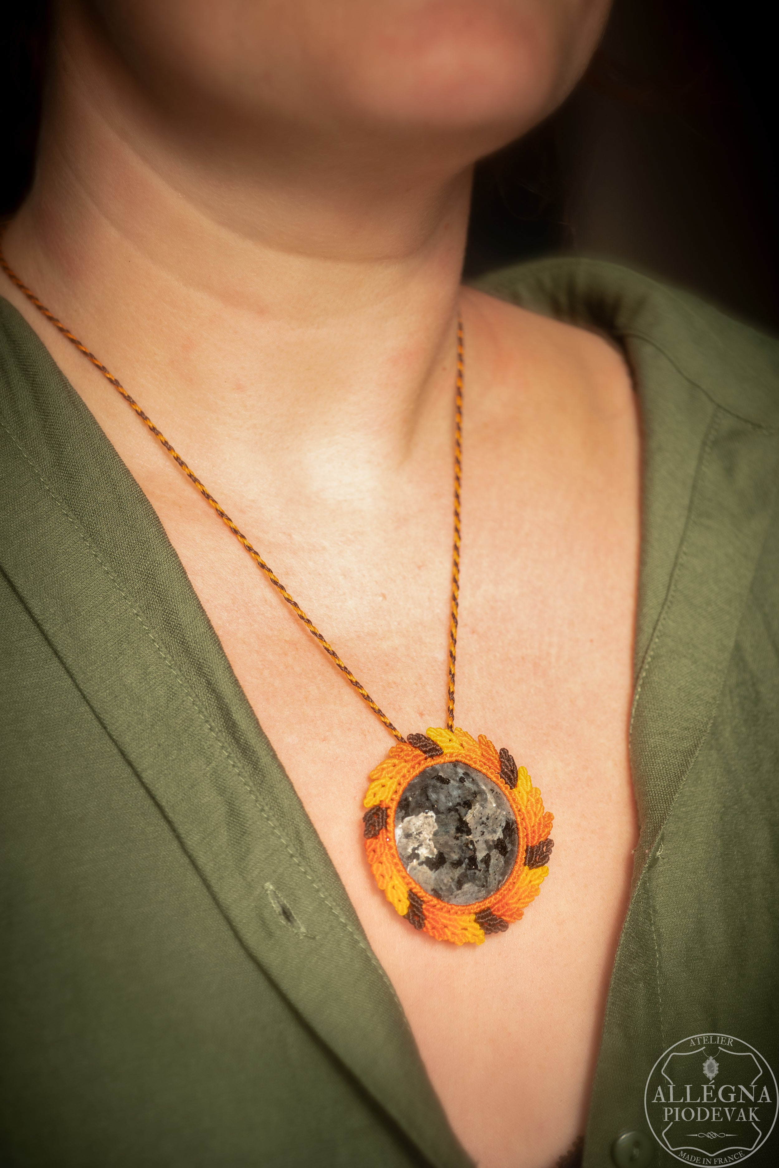 La larvikite scintille au cœur d’un feuillage aux tons chauds, comme un secret chuchoté par la forêt quand l’automne danse sur les feuilles. Ce collier apporte à son porteur élégance et raffinement, soulignant la beauté naturelle et la délicatesse de chaque geste.