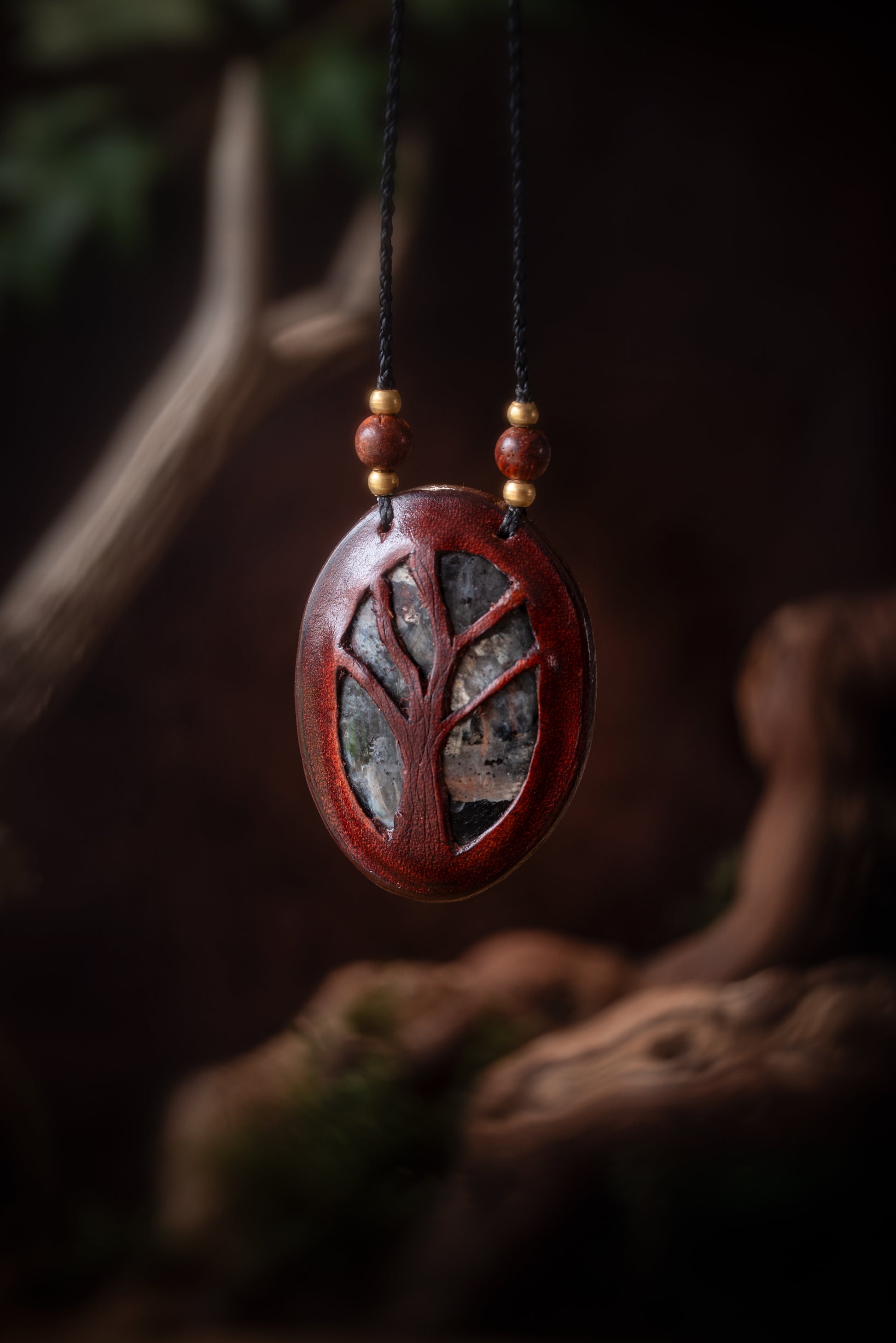 Laissez vous séduire par ce collier unique, alliant la chaleur du cuir à la puissance symbolique de l'arbre de vie, sublimé par une larvikite majestueuse.