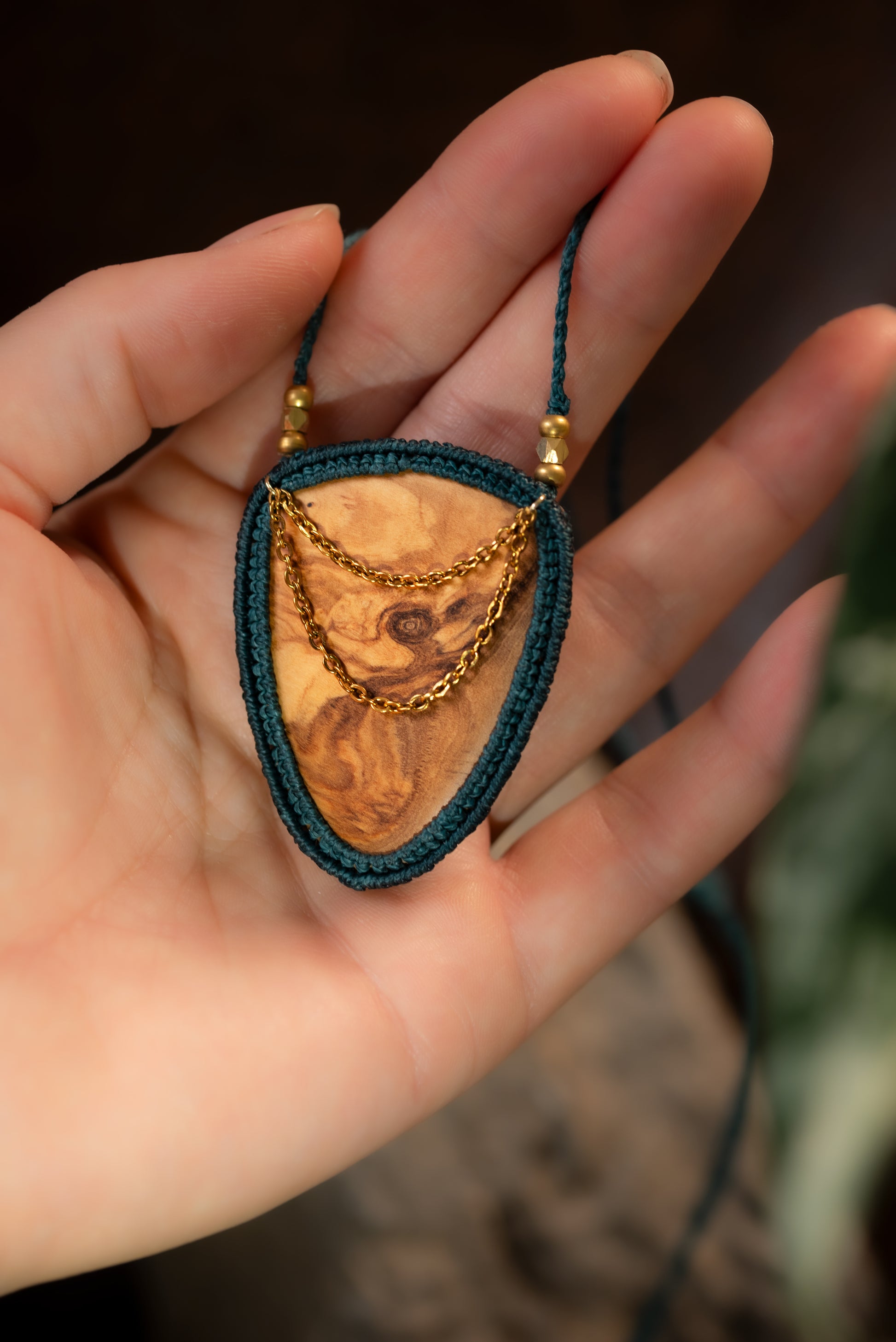 - Bois d’olivier clair aux reflets chauds et doux, rappelant les rayons doux filtrant à travers un olivier centenaire.