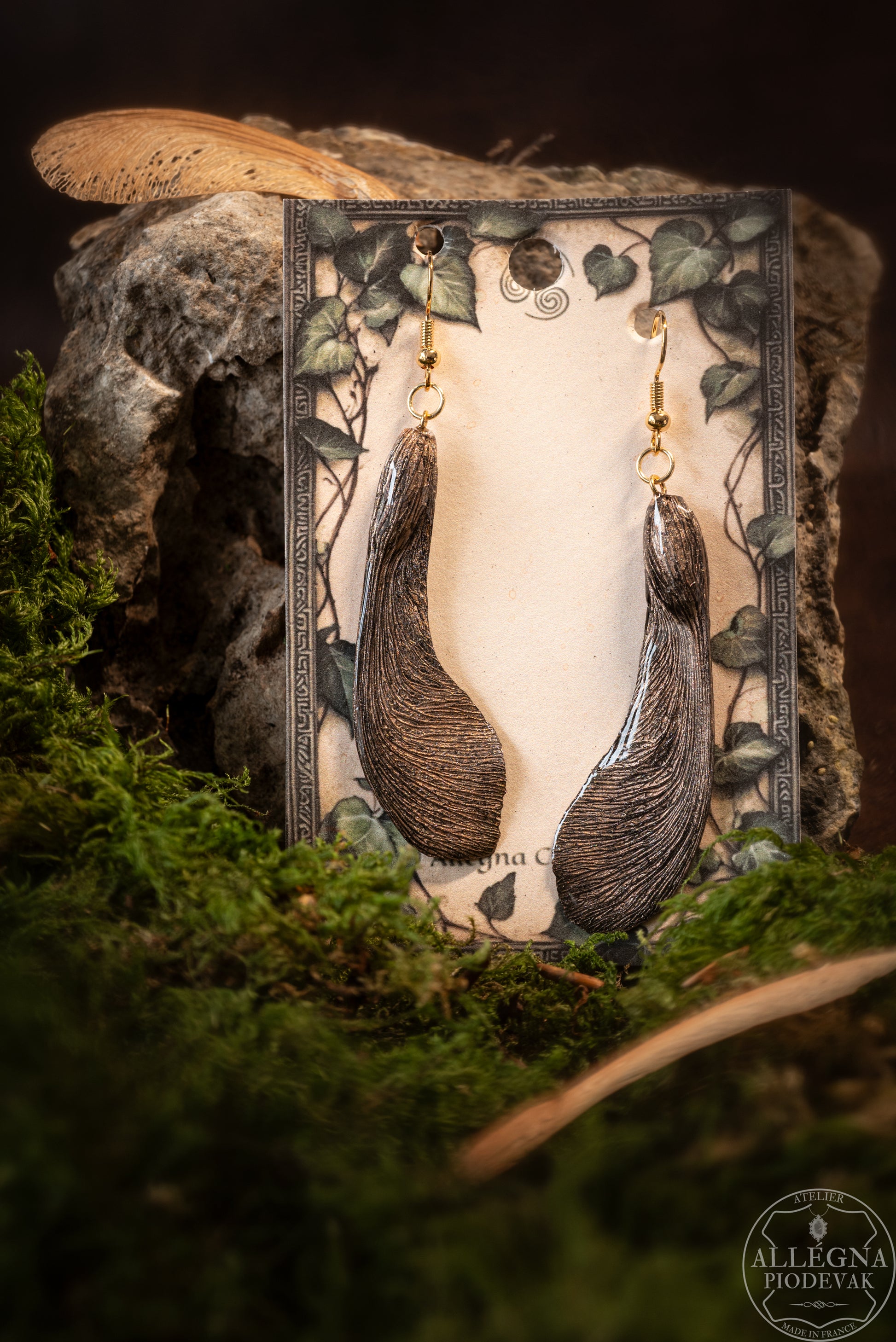 Boucles d’oreilles en samares peintes, inspirées des forêts elfiques. Légères et poétiques, elles célèbrent la magie du vent et des arbres.
